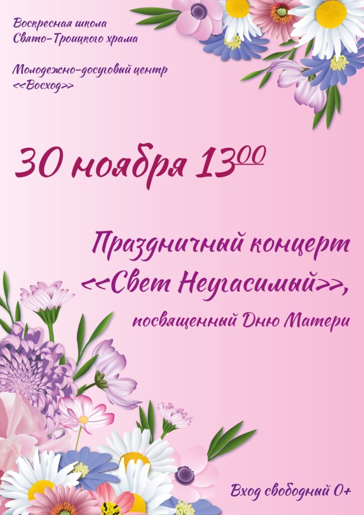 Уважаемые киришане! Приглашаем вас на особенный, душевный праздник! 30 ноября в 13:00 в Молодёжно-досуговом центре «Восход» совместно с Воскресной школой Свято-Троицкого храма состоится праздничный концерт «Свет Неугасимый», посвящённый Дню матери. Ждём всех желающих разделить с нами радость этого дня! Вход свободный.