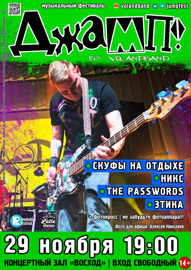Уважаемые киришане! 29 ноября в Молодёжно-досуговом центре “Восход” состоится музыкальный фестиваль «ДЖАМП». Ждем всех любителей живой музыки на концерте! В программе:• Скуфы на отдыхе• НИКС• The Passwords• ЭТИКА Начало в 19:00.Вход свободный!